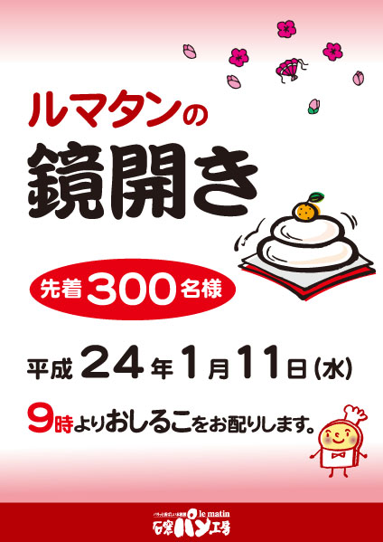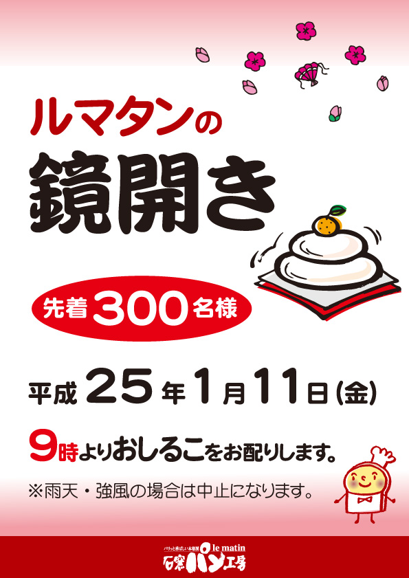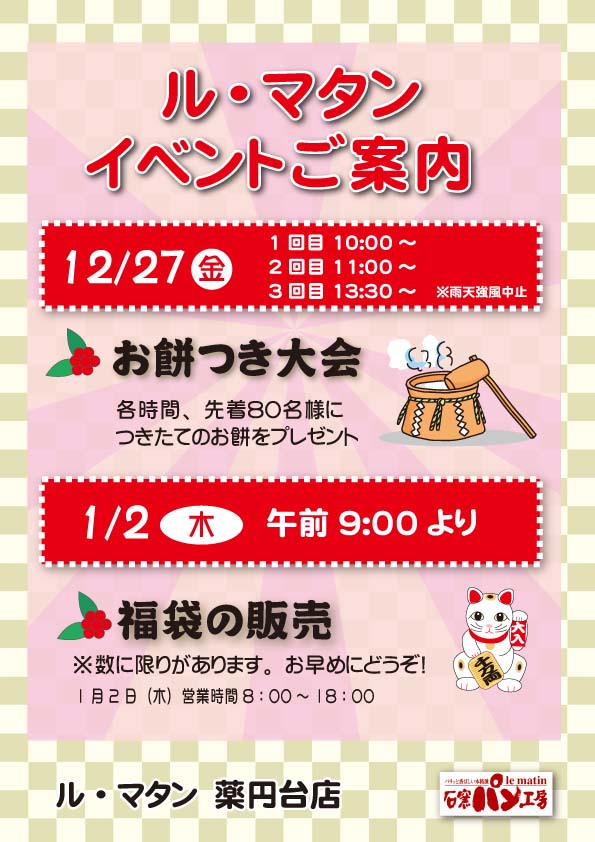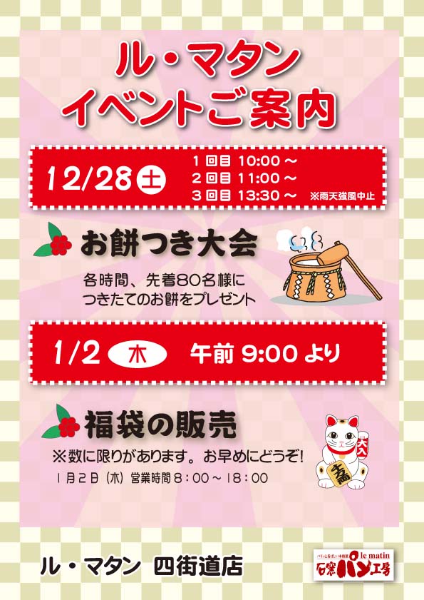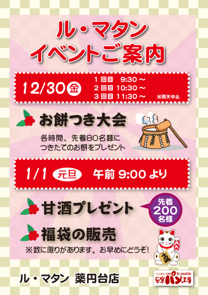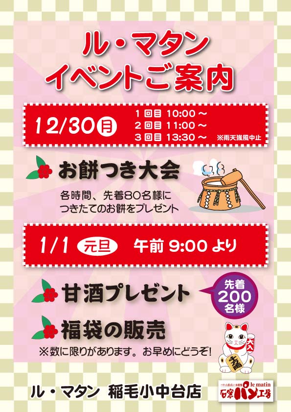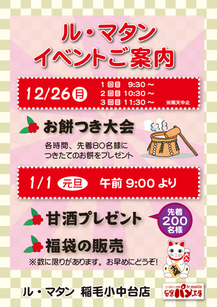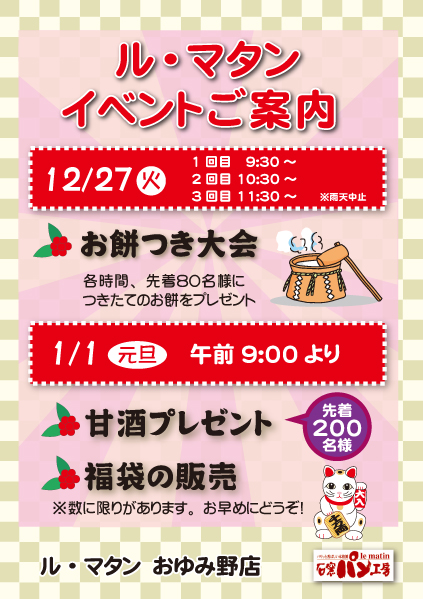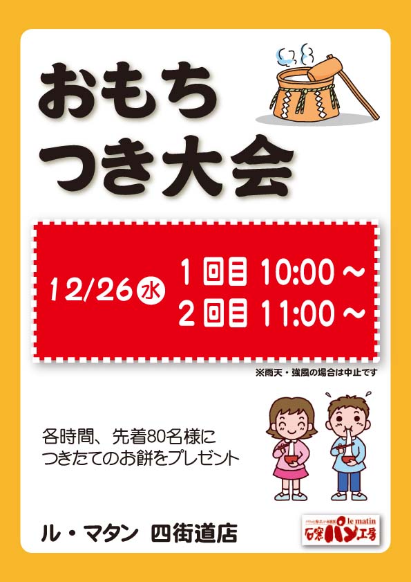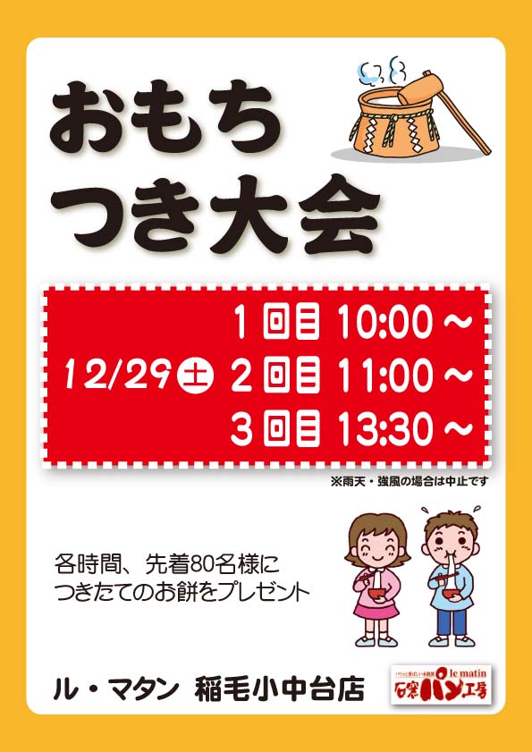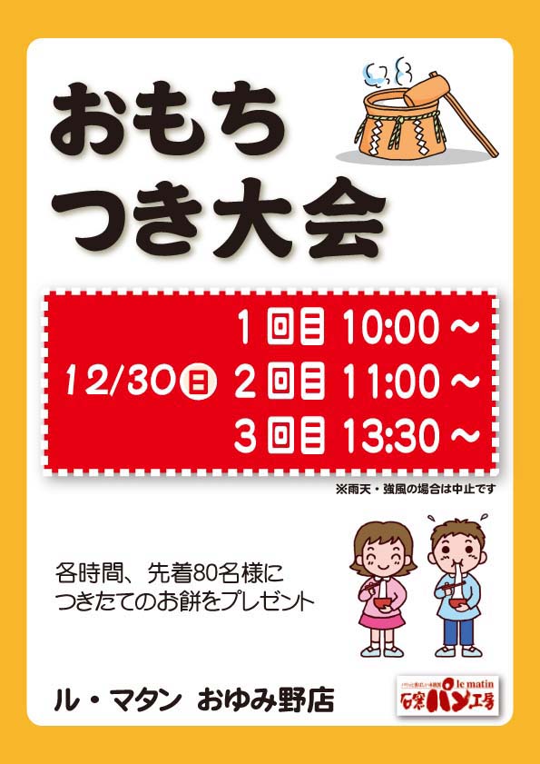 ◎おもちつき :各時間、先着80名様につきたてのお餅をプレゼントいたします