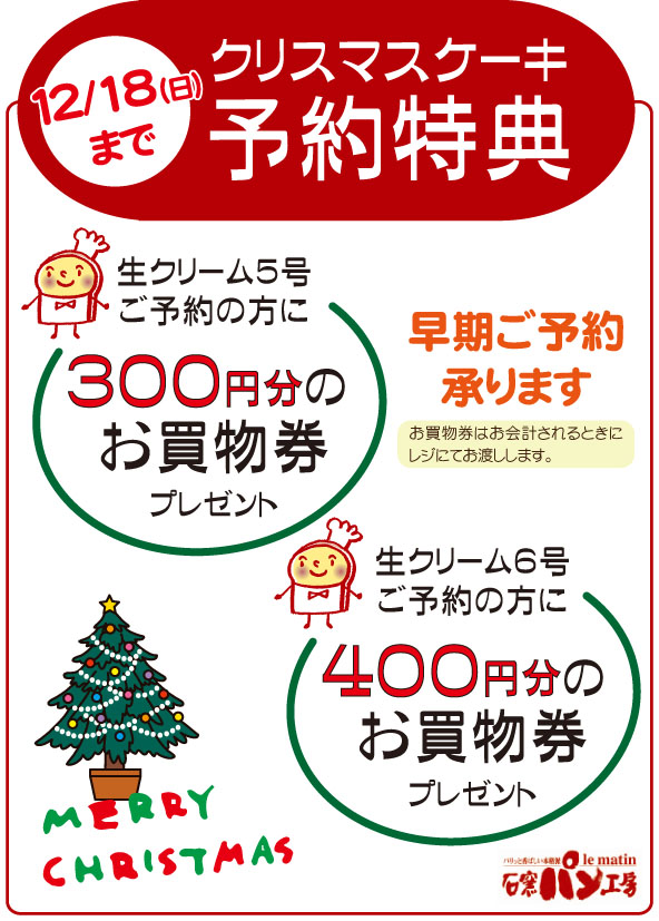 クリスマスケーキご予約の特典としまして、生クリーム5号をご予約の方に300円分、生クリーム6号をご予約の方に400円分のお買い物券をプレゼント!