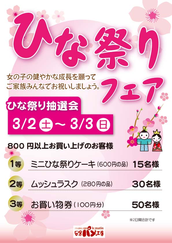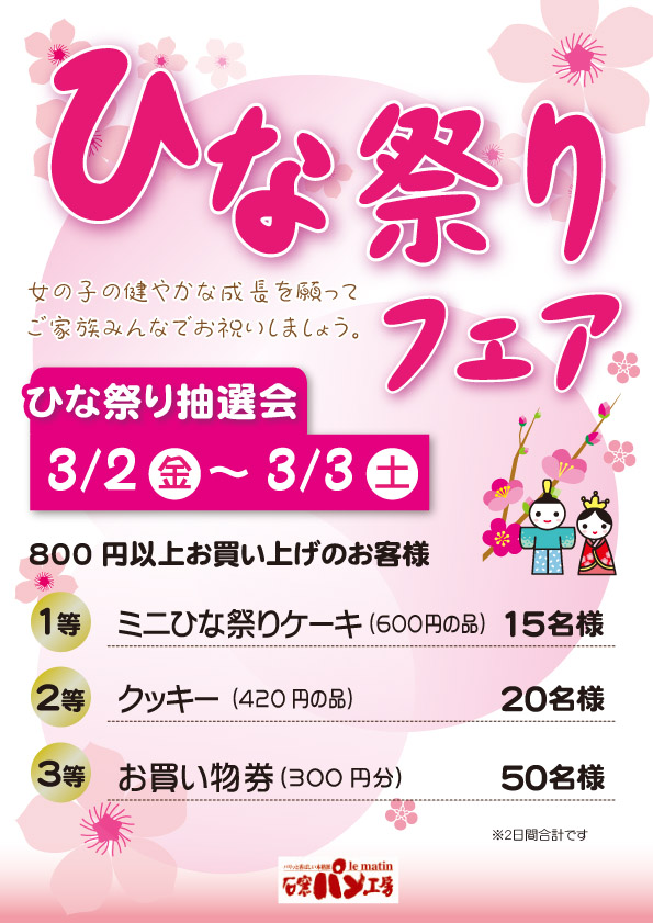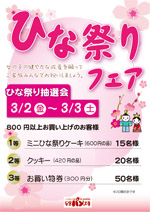 2010.03.023月2日〜3日・ひなまつり抽選会/期間中700円以上お買い上げの方に、抽選でプレゼント致します。