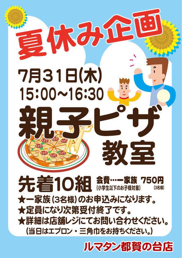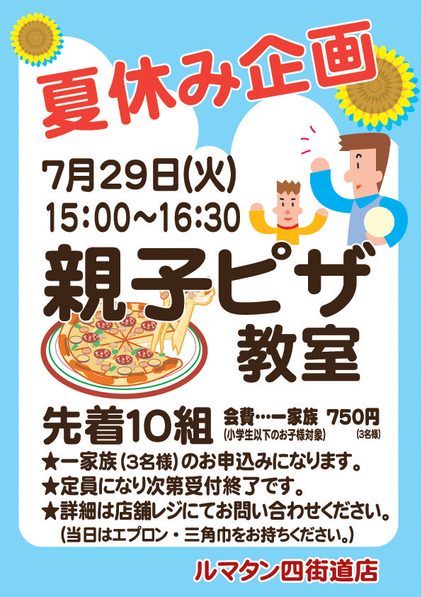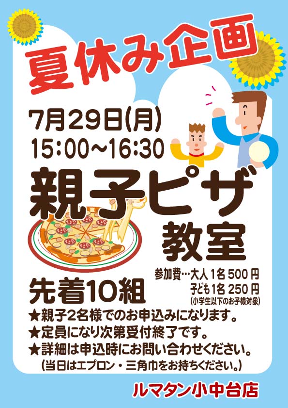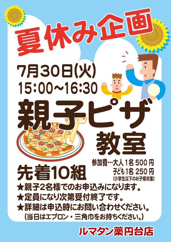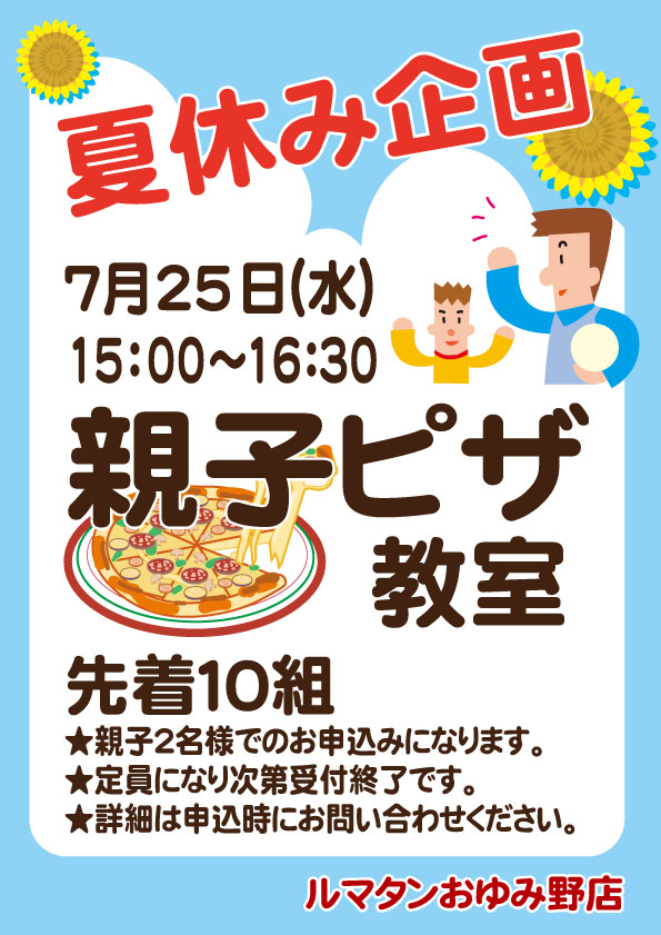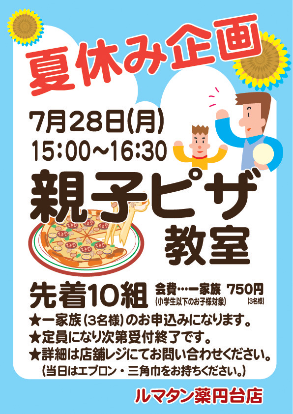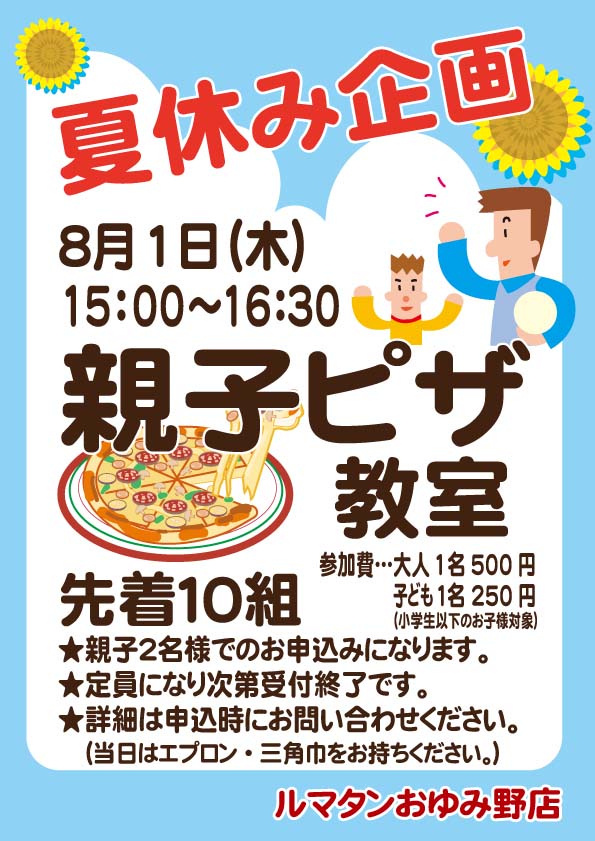 ル・マタン(おゆみ野店・薬円台店・四街道店・都賀の台店・)では、この夏休みの大切な思い出作りの一つとして親子ピザ教室を開催いたします。