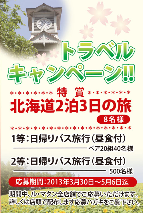 2013.03.30◎北海道2泊3日の旅が当たる!トラベルキャンペーン実施中♪