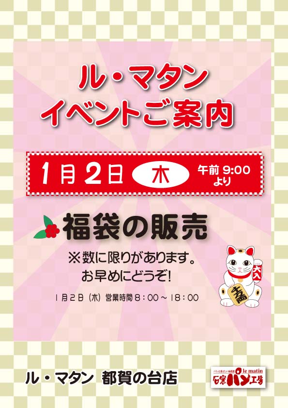 ◎福袋販売 :各日午前9時よりスタートです。数に限りがございますのでお早目にどうぞ!